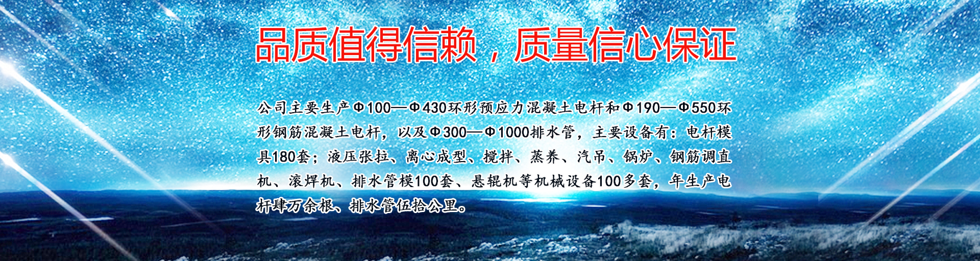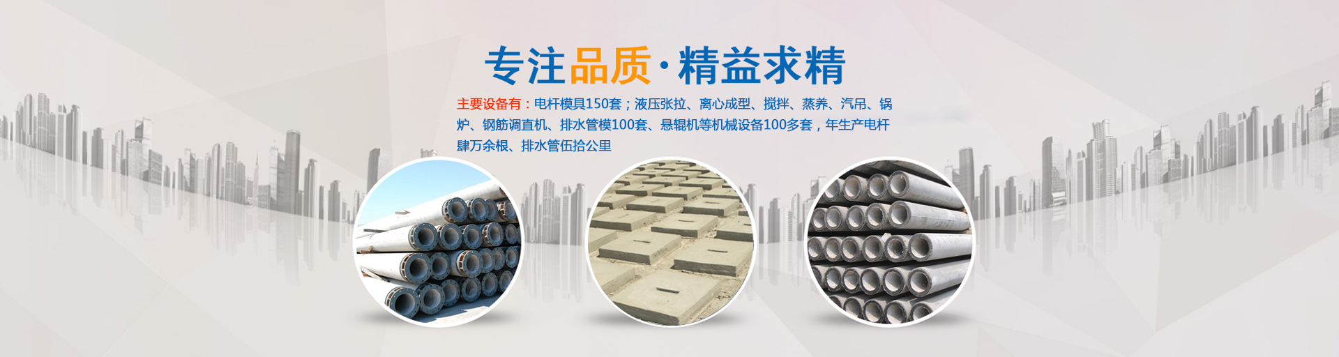 公司主要生產ф100—ф430環(huán)形預應力混凝土電桿和ф190—ф550環(huán)形鋼筋混凝土電桿,以及ф300—ф1000排水管,主要設備有:電桿模具180套;液壓張拉、離心成型、攪拌、蒸養(yǎng)、汽吊、鍋爐、鋼筋調直機、滾焊機、排水管模100套、懸輥機等機械設備100多套,年生產電桿肆萬余根、排水管伍拾公里?!?